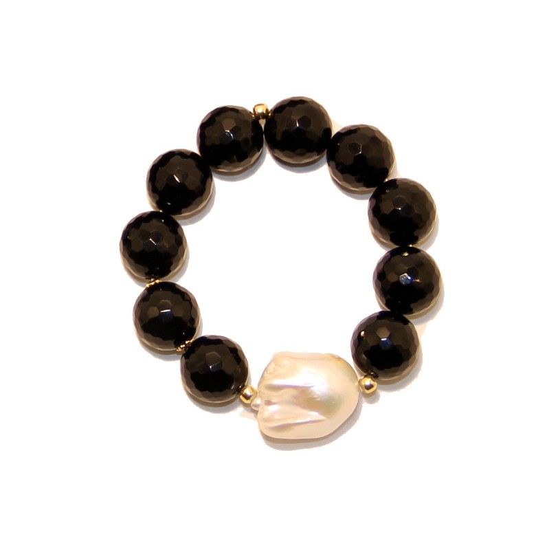Pulsera elástica de onix y perla barroca fabricada en plata 925 dorada